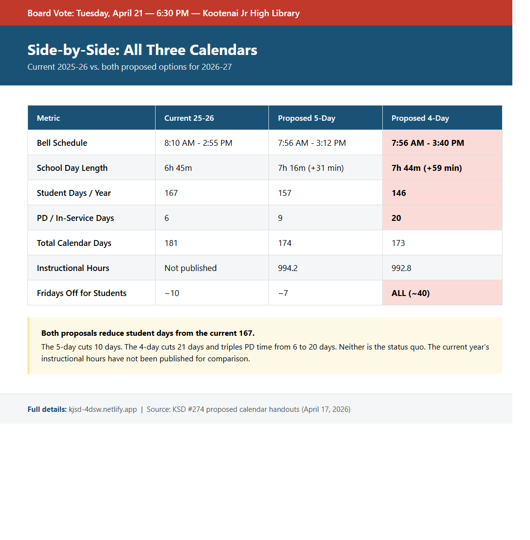 Everything you need to know in one printable page: the schedule change, what wasn't on the handout, the cost to families, bus route impact, and questions for the board. Print it, tape it to the bulletin board at the post office, or hand it to someone at the store.