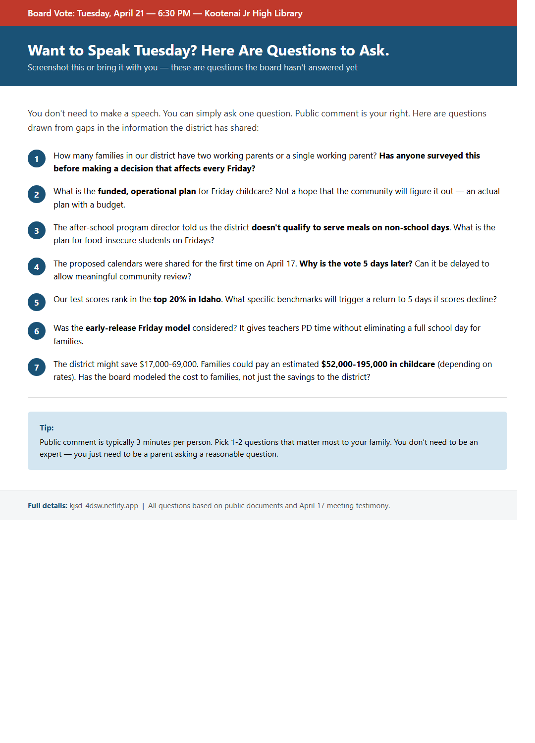 Seven specific questions the board hasn't answered yet. Pick 1 or 2 that matter to your family. You can read directly from the page — you don't need to prepare a speech. Public comment is your right.